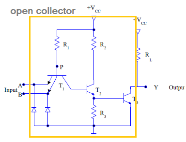 พอเราจะใช้ Open Collector เราก็ต่อ RL เข้ากับ Vcc ที่เป็นเป้าหมาย พอเป็น Logic 1 T3 Off แรงดันเอาต์พุตมันก็เป็น Vcc ที่เป็นเป้าหมายไงครับ