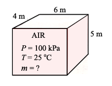 - Determine the mass of the air in a room whose dimension are 4m´5m´6m at 100 kPa and 25°C.