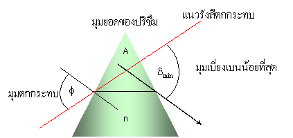 f มุมเบี่ยงเบนจะเปลี่ยนไปและจะมีค่าน้อยที่สุด dminเมื่อเส้นรังสีทั้งสองด้านของปริซึมสมมาตรกัน และจะได้ว่า