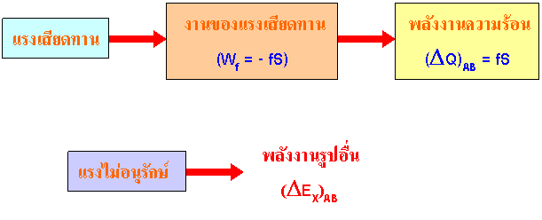 ในกรณีที่มีแรงเสียดทานและแรงไม่อนุรักษ์กระทำต่ออนุภาคด้วย จะได้ว่า