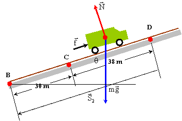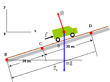 จงหาว่ารถคันนี้จะยังคงเคลื่อนที่ต่อไปบนพื้นเอียงอีกเป็นระยะทางเท่าใด