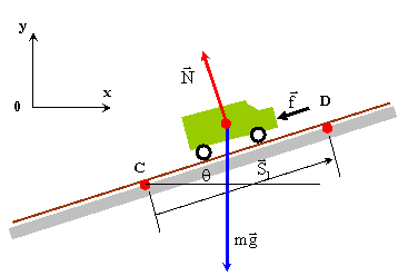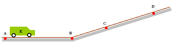 รถคันนี้จะเคลื่อนที่ถอยหลังกลับลงมาตามพื้นเอียงและหยุดที่จุด E